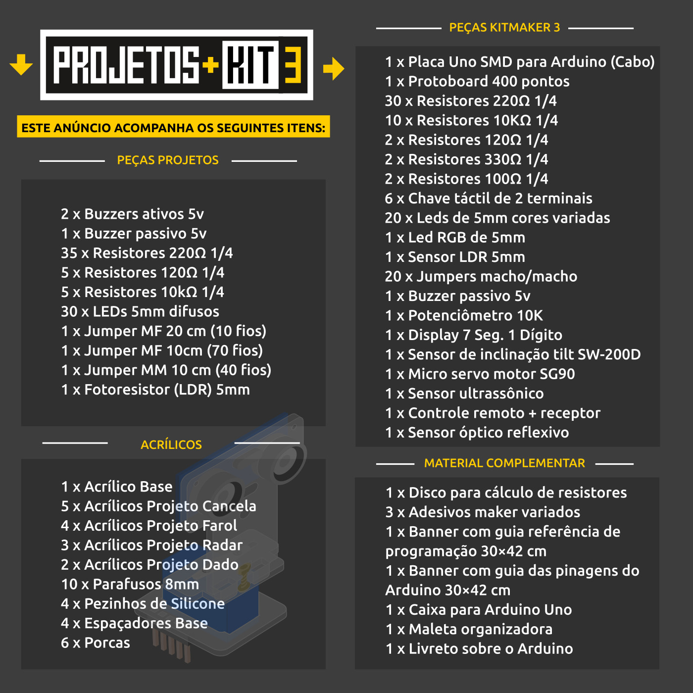 Juntamente as peças e suportes de acrílicos para montagem dos projetos, você também receberá o nosso kitmaker iniciante 3, que é excelente no quesito custo/benefício. O kit permite a realização de diversos projetos, dentre eles, projetos com medição de distâncias entre objetos, controle de equipamentos via controle remoto, projetos sonoros, diferenciar tonalidades de superfícies, dentre outros.